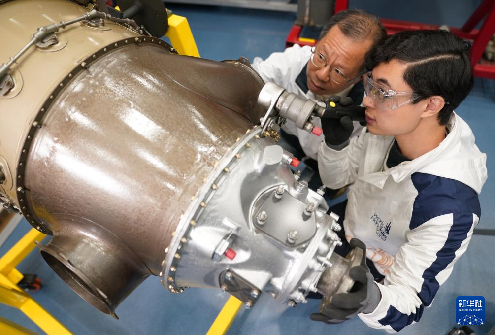 在香港专业教育学院,黄富东(右)在检查涡轮螺旋桨飞机引擎(1月14日摄)。新华社发(王申摄)