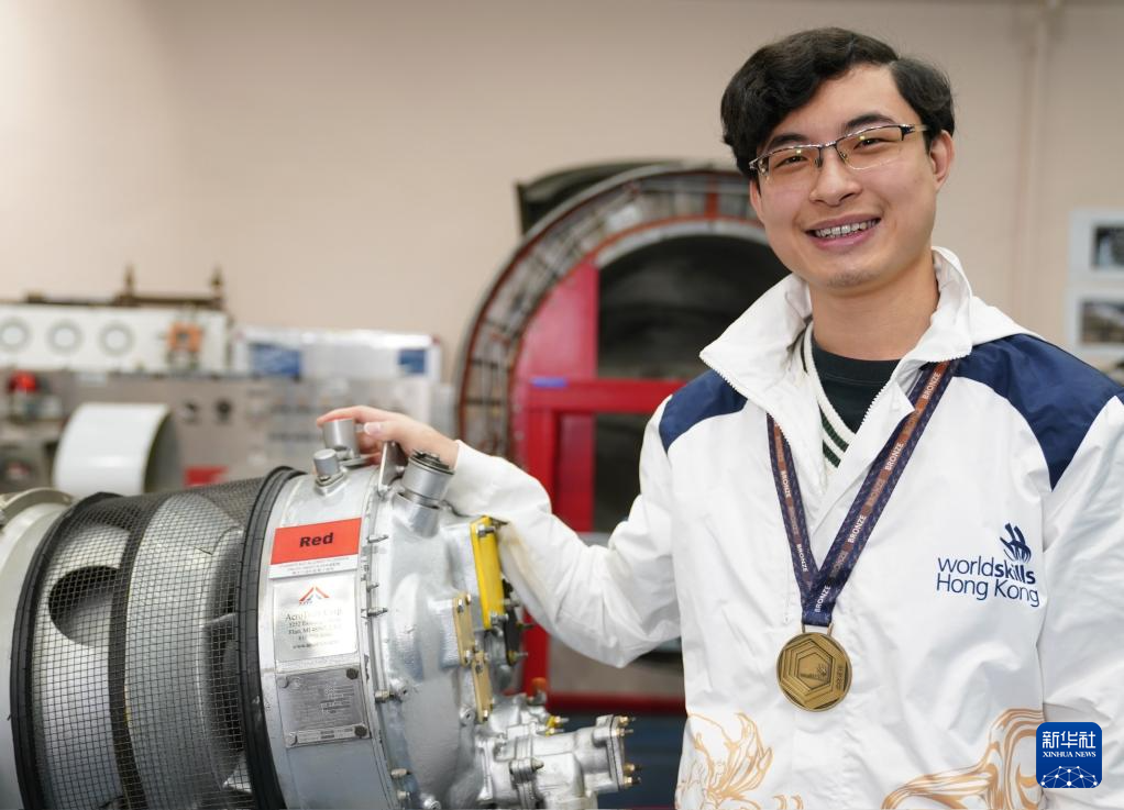 在香港专业教育学院,黄富东佩戴着“2024年里昂世界技能大赛”飞机维修项目的铜牌和涡轮螺旋桨飞机引擎合影(1月14日摄)。新华社发(王申摄)
