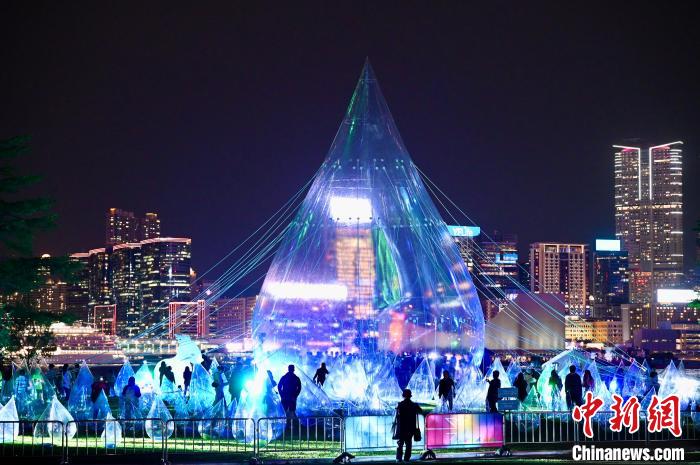 4月3日晚,香港有民众到位于金钟的添马公园参观大型艺术装置“舞动水滴展”。(资料图)中新社记者 李志华 摄
