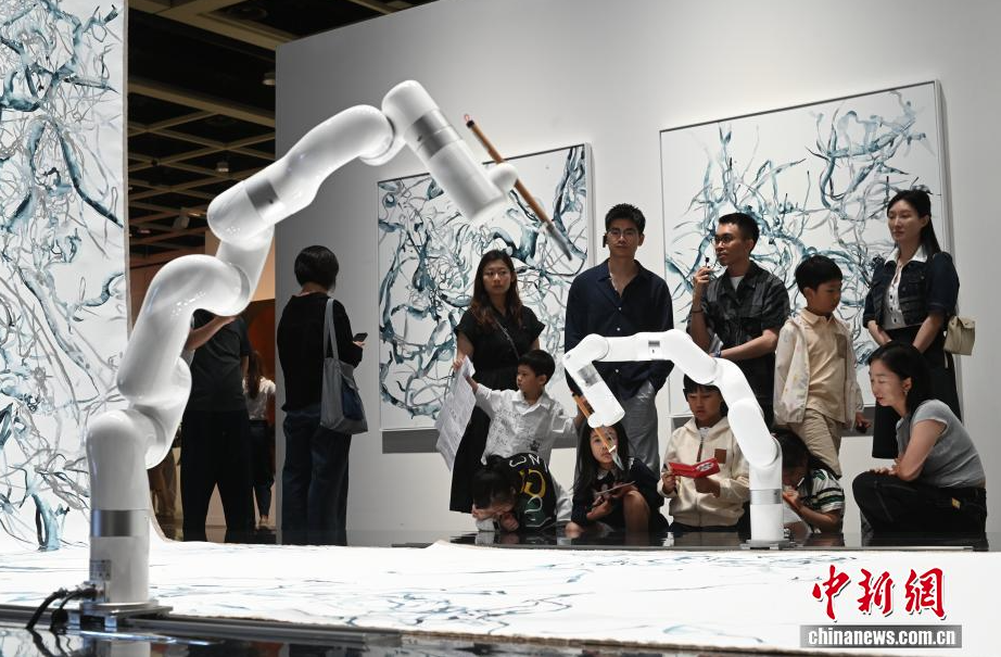 图为参观人士认真观看以机械臂绘制的艺术品。中新网记者 李志华 摄