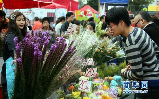 水仙、杜鹃、富贵菊、富贵竹、梅枝、桃花、蝴蝶兰、惠兰、罗汉松……千娇百媚、五颜六色,吸引大批市民和游客驻足欣赏。有小朋友穿上新年唐装,随父母逛花市,见到鲜艳的盆景,兴奋不已,叫嚷着家人为自己拍照。也有年轻夫妇在兰花摊档,为父母挑选新年花礼。