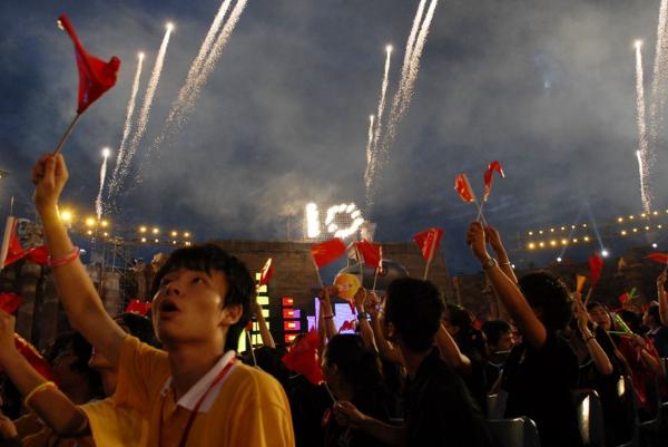 “深港青少年万人联欢主题晚会”上有用烟火砌成的“10”字,庆祝香港回归十周年。(图片来源:文汇报)