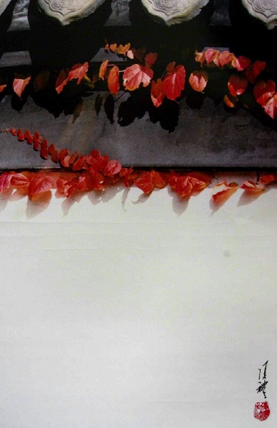 我也告诉学思,曾经在《摄影世界》杂志看过陈复礼的一幅作品《霜叶红于二月花》。这幅作品构图简洁,虽然只截取一段小屋檐,但却透过檐下的寥寥红叶,展现了与春光斗艳的绚丽秋色,彰显出生机勃勃的生命力,观之和谐舒畅,品之耐人寻味。
