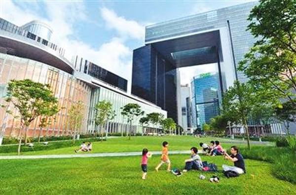 资料图:香港特区政府大楼建筑造型寓意“门常开,水长流”,风景优美。