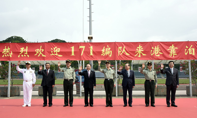 本网讯 4月30日上午,中国海军171舰艇编队靠泊香港欢迎仪式在驻港部队昂船洲军营举行。我办主任王志民、副主任何靖与特区政府政务司司长张建宗,外交部驻港特派员公署署理特派员杨义瑞,解放军南部战区副政委兼政治部主任姚勇良,驻港部队司令员陈道祥、政委蔡永中,南部战区海军副参谋长李晓岩等嘉宾出席。特区政府有关官员、我办有关部门负责人及500多名香港市民参加。欢迎仪式后,嘉宾及市民分批参观了舰艇编队。