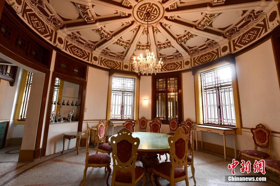 景贤里主楼内饭厅设计典雅,地面铺有云石地砖由嵌花马赛克砌成的图案,天花运用仿似宫殿式的藻井设计,极具中国建筑设计特色。中新社记者 李志华 摄