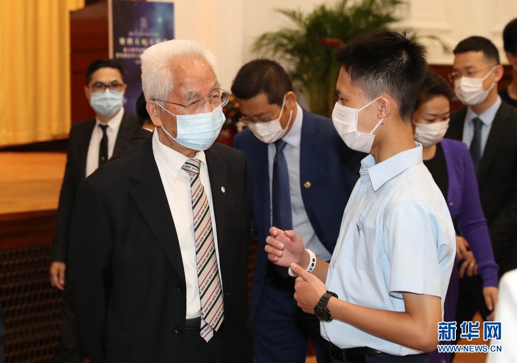 6月24日,在香港大学,中国工程院院士、长征系列火箭总设计师龙乐豪(前左)与学生交流。(新华社记者 李钢 摄)