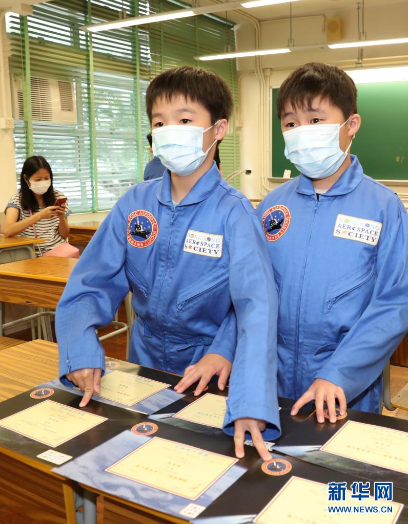6月21日,保良局林文灿英文小学五年级学生谭梓浚(右)、谭梓锋两兄弟在展示他们获得的航天知识课程证书。(新华社记者 李钢 摄)