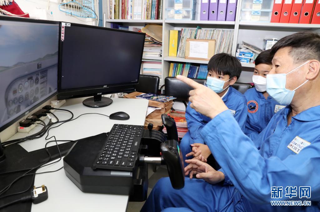 6月21日,在位于何文田的陈瑞祺(喇沙)小学的一个教室中,香港航天学会会长雷健泉(前)与学生交流航空、航天知识,指导练习模拟飞行。(新华社记者 李钢 摄)