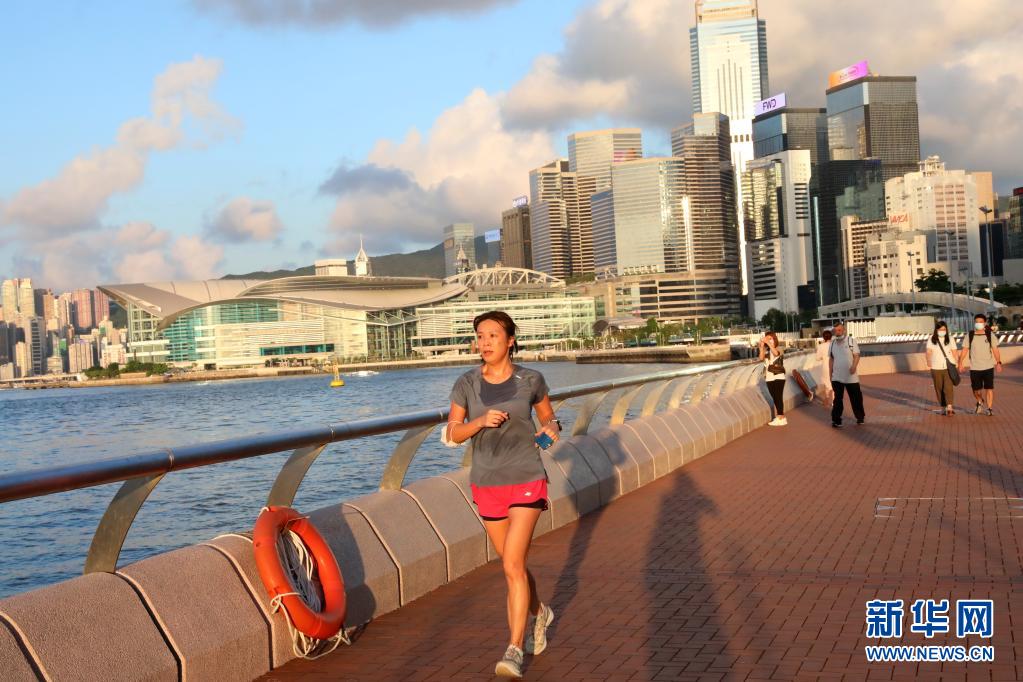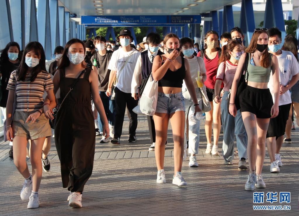 7月8日拍摄的香港中环海滨长廊上的行人。(新华社记者 吴晓初 摄)