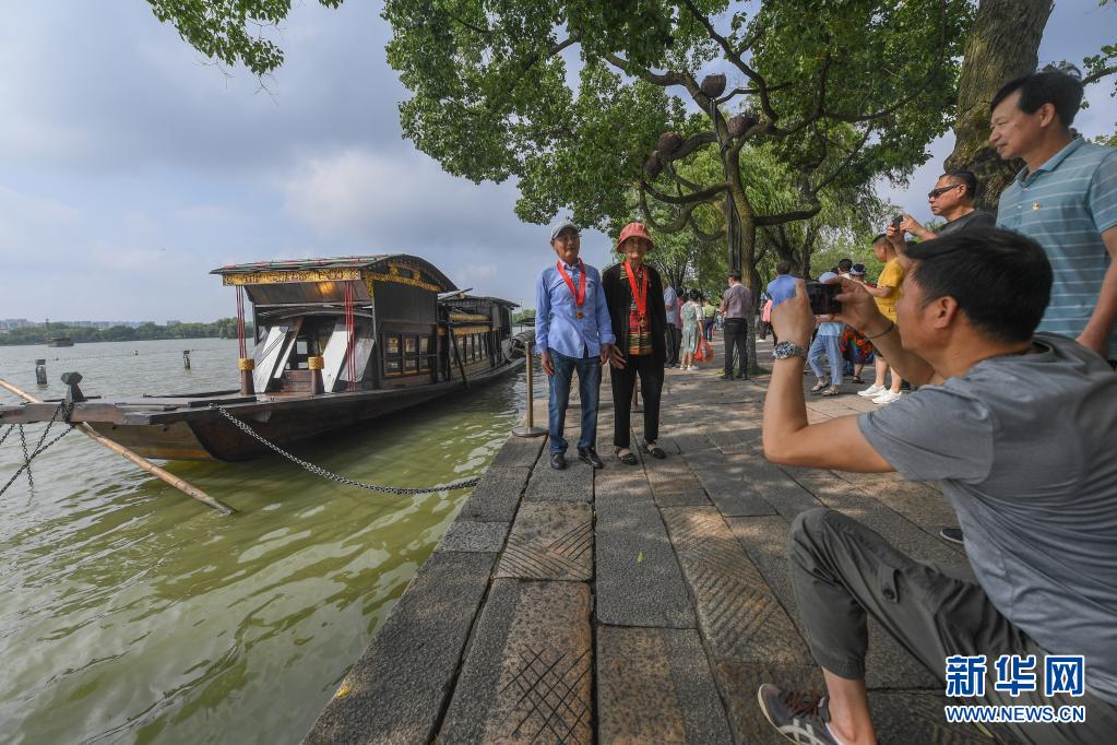 7月1日,两名老党员在浙江嘉兴南湖湖心岛停泊的南湖红船旁拍照留影。(新华社记者 徐昱 摄)