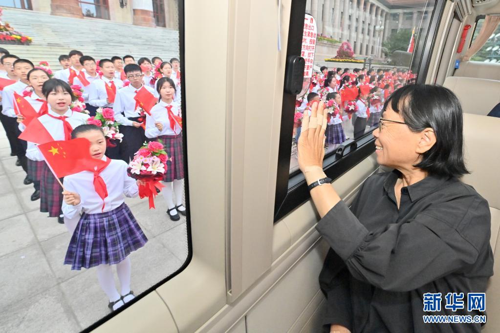 6月29日,庆祝中国共产党成立100周年“七一勋章”颁授仪式在北京人民大会堂金色大厅隆重举行。这是“七一勋章”获得者张桂梅向青少年致意。(新华社记者 岳月伟 摄)