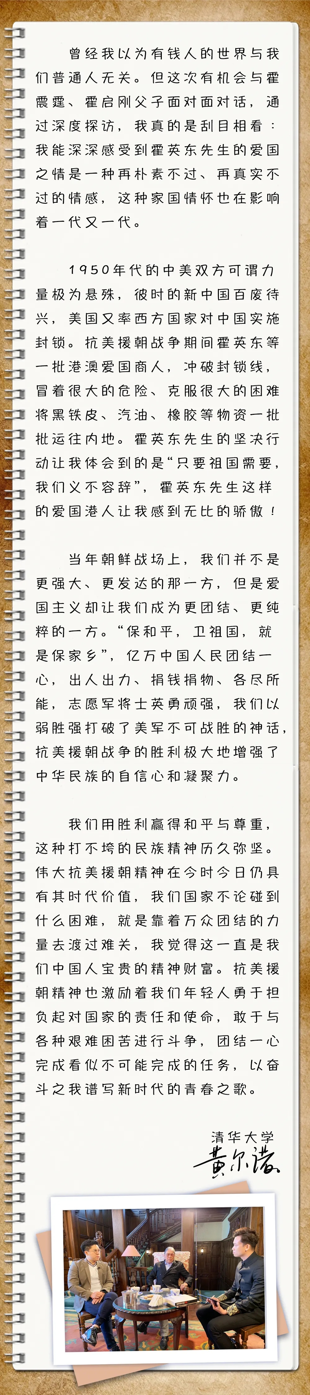 我是黄尔诺,作为一名香港的年轻人,霍英东这个名字我从小就知道,但也感觉距离自己很遥远。当我得知要探访霍英东与抗美援朝的故事时,我很诧异,当年的抗美援朝难道与香港也有着某种关联?一个香港商人又怎么会与2000公里以外的朝鲜战场发生关系呢?