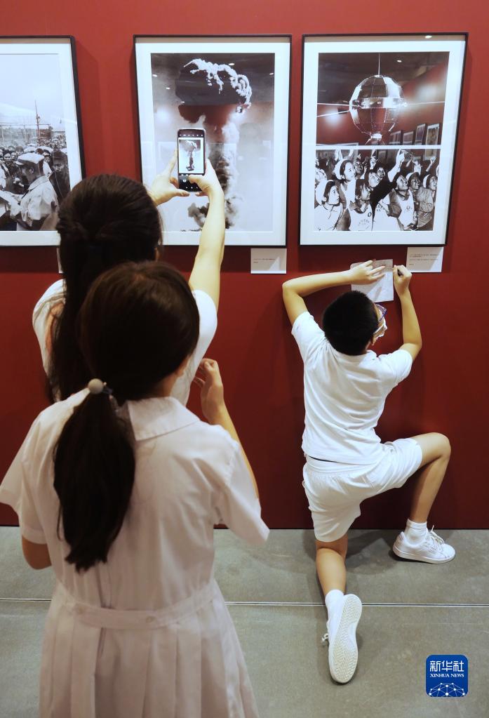 互动区域滚动播放新华社“国家相册”微纪录片,长凳坐满了,观众就站在后边。头发花白的区炳培和太太看得意犹未尽,他告诉记者,这一圈老照片看下来真是鼓舞人心。从新中国成立,到中国第一颗原子弹爆炸成功,再到香港回归,还有去年内地驰援香港开展新冠病毒检测,每一张照片都让他热泪盈眶。