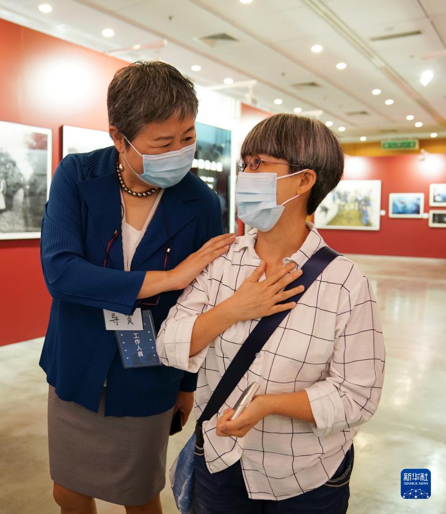 在“修例风波”期间被称为“正义姐”的蓝雪宝(右)看了展览,感动不已(10月10日摄)。(新华社记者 李钢 摄)