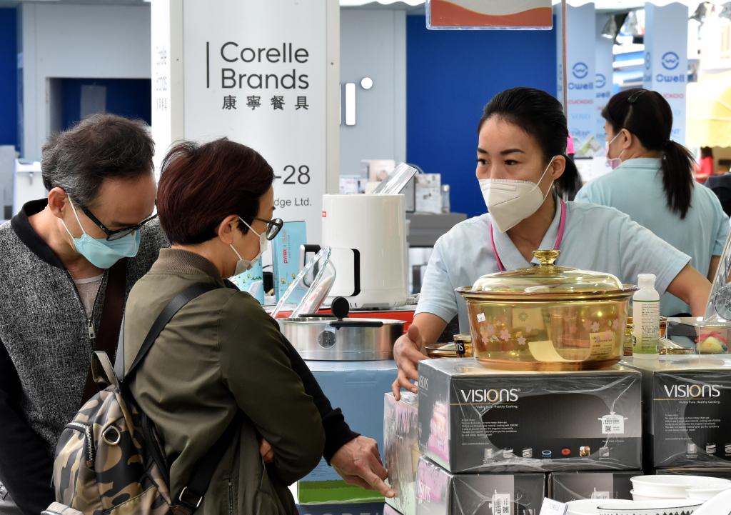 12月22日,在香港工展会上,商贩在摊位向市民促销厨具。(新华社记者 卢炳辉 摄)
