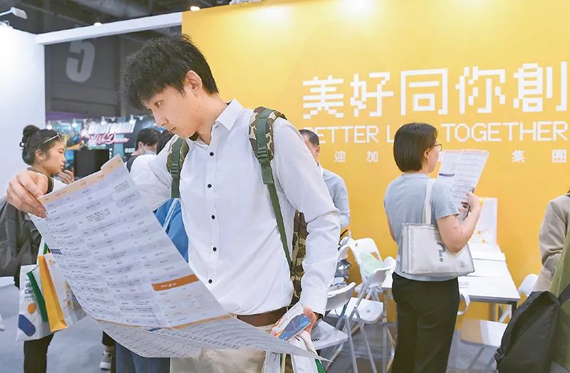 在粤港澳三地和有关部门有力推动下,大湾区建设热潮澎湃,城市之间“互相奔赴”密集涌现,创新驱动力不断增强。图为2023年11月4日,在“创新香港—国际人才嘉年华2023”上,一名求职者浏览华润公司的招聘信息。 新华社记者 陈铎/摄