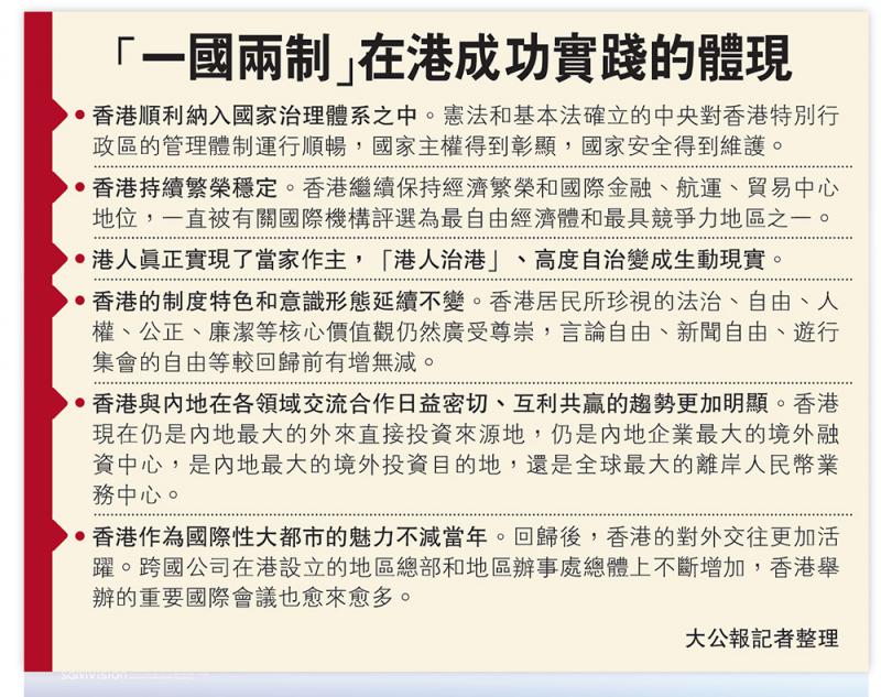 港区全国人大代表、前海管理局香港事务首席联络官洪为民指出,香港回归以来,通过坚守“一国”之本、善用“两制”之利,“一国两制”的实践充满活力、日益完善,香港的发展空间有增无减。他认为,从基本法起草到特区管治,中央一直充分聆听、尊重港人意见,内地与香港亦建立起大量畅顺、有效的沟通互动渠道,推动两地共同发展、共享成果,而这一切都要在维护国家统一与利益的前提下实现。