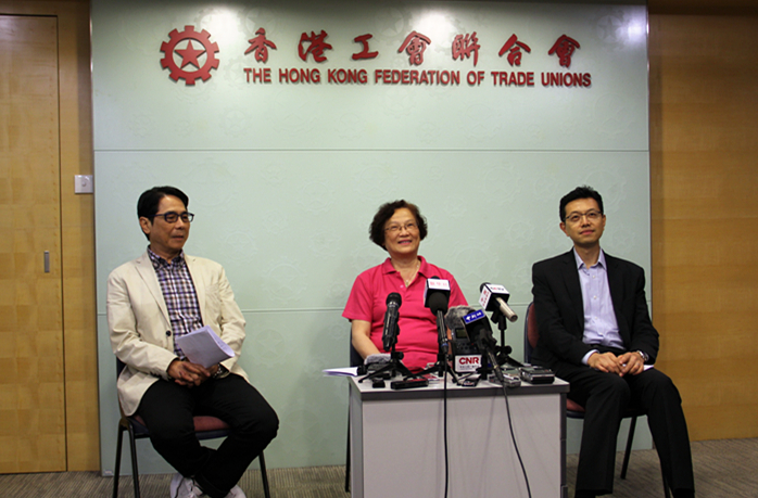香港工联会会长林淑仪(中)、副会长黄国建(左)及理事长吴秋北(右)接受媒体采访。