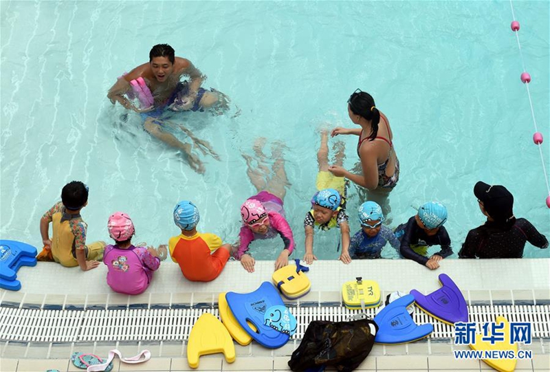 回归祖国20年来,在香港特区政府、社会各界和内地的大力支持下,来自香港的运动员在赛场上争金夺银、屡创佳绩,香港体育蓬勃发展惠及民生。这是小朋友在香港九龙公园游泳池参加游泳训练班(2017年6月4日摄)。(新华社记者 卢炳辉 摄)