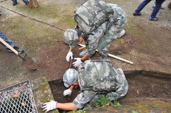 驻港部队官兵用手疏通排水渠堵塞。(图片来源:中央政府驻港联络办)