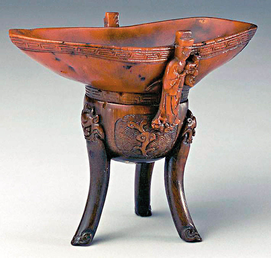 清犀角雕梅枝仿古纹四足匜式杯 叶义捐赠