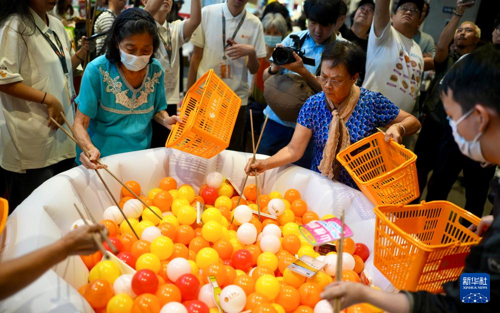 8月14日,观众在第35届美食博览上参加互动游戏。新华社发(吕小炜 摄)