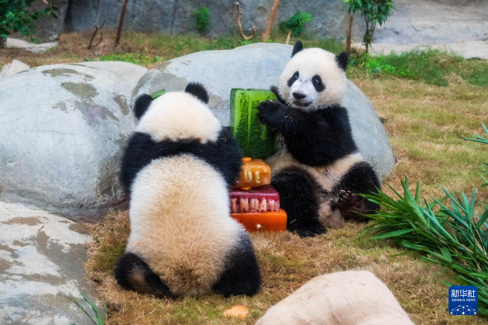 8月15日,大熊猫宝宝“加加”(左)“得得”在香港海洋公园庆祝一岁生日。新华社记者 朱炜 摄