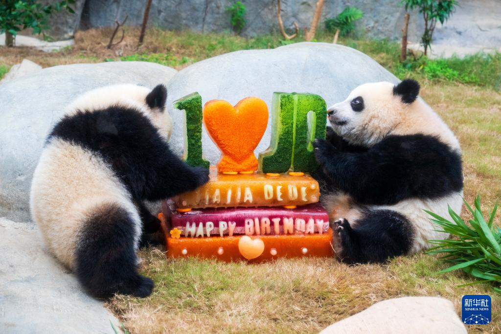 展馆外,有不少市民和旅客头戴生日礼帽拿着“加加”“得得”的玩偶等待入场。香港市民何小姐也在等待进入场馆“二刷”。“看着它们从小时候爬来爬去到现在活蹦乱跳,很感动,希望以后的每一次生日,我们都一起度过。”她说。
