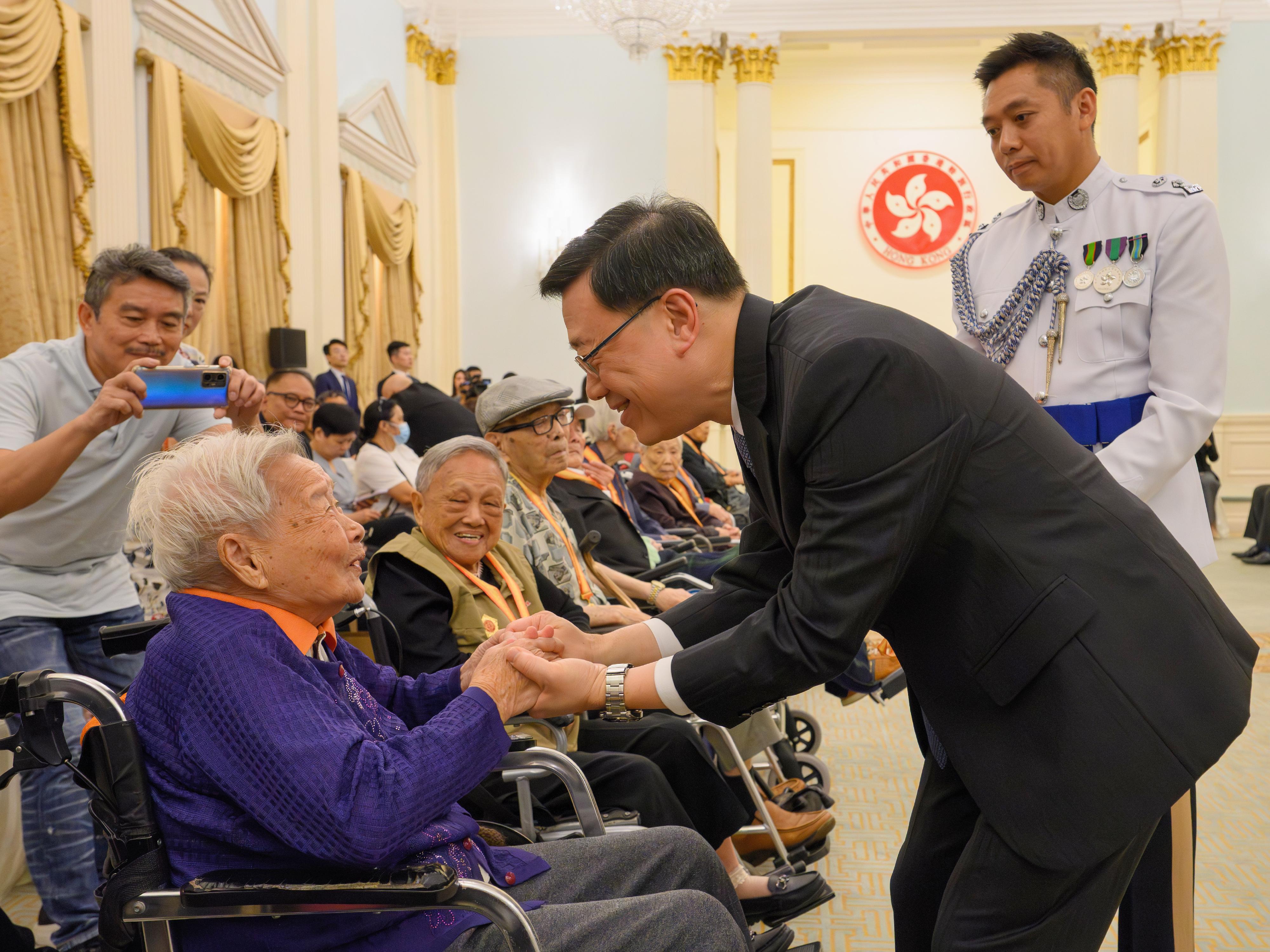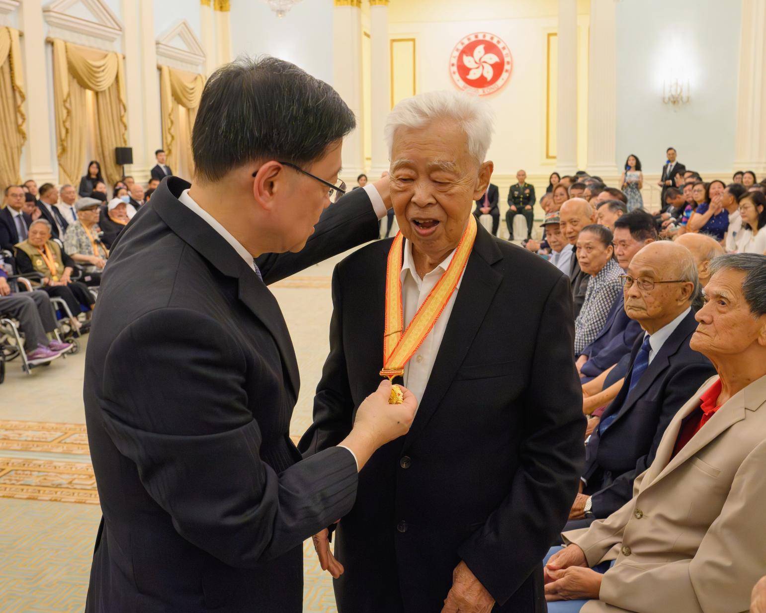 香港特别行政区政府8月22日于香港礼宾府举行“中国人民抗日战争胜利80周年纪念章颁授仪式”,向在港健在并曾参加抗战的老战士、老英雄,抗战将领或其遗属,颁发由国家授予的纪念章。
