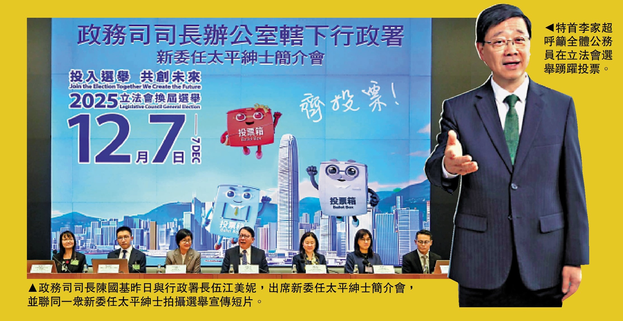 左图:政务司司长陈国基11月13日与行政署长伍江美妮,出席新委任太平绅士简介会,并联同一众新委任太平绅士拍摄选举宣传短片。右图:特首李家超呼吁全体公务员在立法会选举踊跃投票。