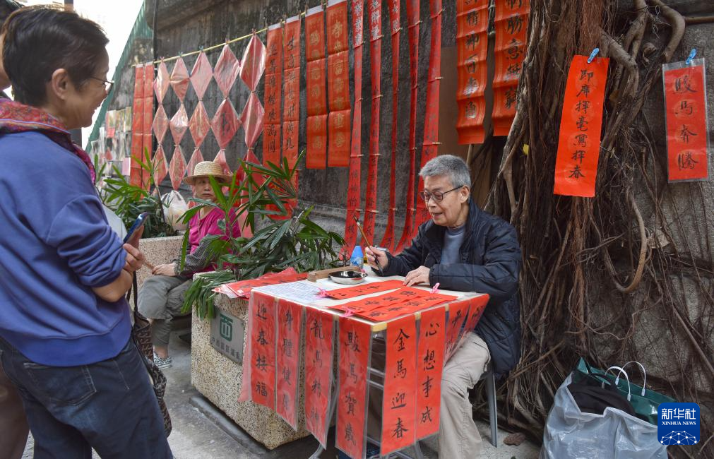 2月4日,书画师傅在香港上环楼梯街为市民书写新年祝福。新华社记者 陈铎 摄