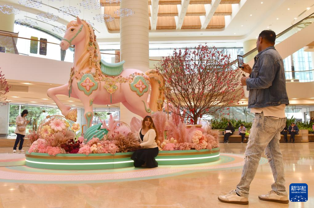 2月10日,人们在香港太古广场拍摄刺绣骏马。新华社记者 陈铎 摄