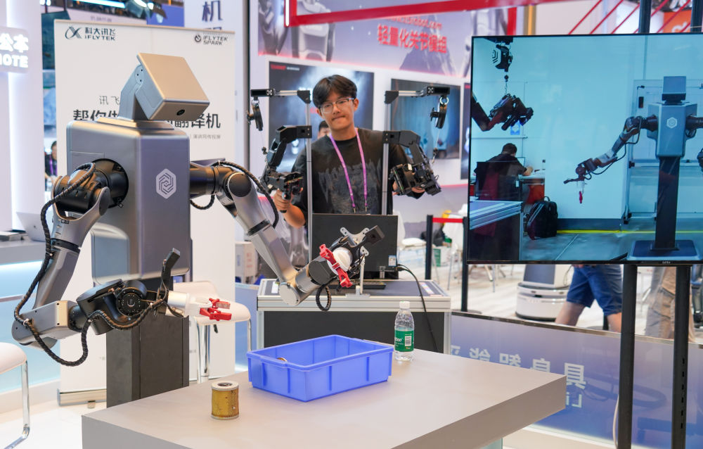 2025年10月16日,工作人员在第138届广交会科大讯飞展台操作机器人拿取物品。新华社记者 肖恩楠 摄