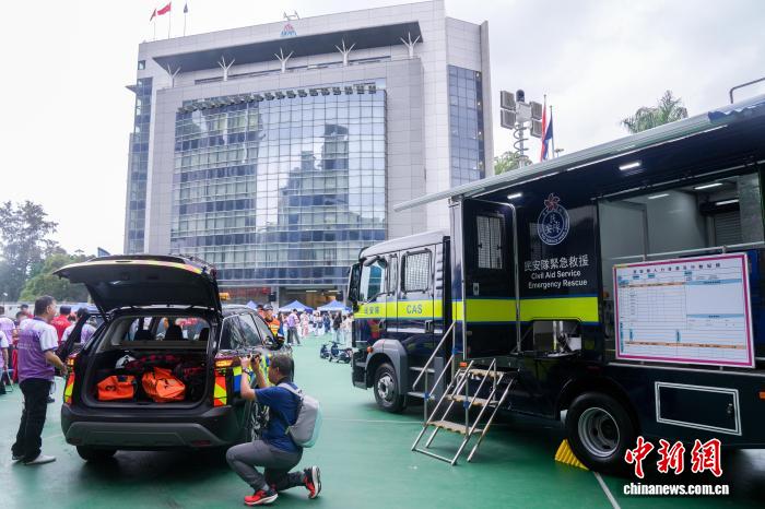 4月11日,今年“全民国家安全教育日”到来前夕,香港民众安全服务队总部举行开放日活动。图为市民参观紧急救援车辆。中新社记者 张祥毅 摄