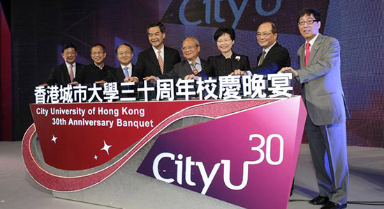 香港城市大学11月1日在香港会展中心举行三十周年校庆晚宴,城大支持者、校友等嘉宾以及师生职员共800多人欢聚庆贺。香港特区行政长官及城大监督梁振英、中央政府驻港联络办副主任王志民、香港特区政务司司长林郑月娥、立法会主席曾钰成、教育局局长吴克俭等担任主礼嘉宾。