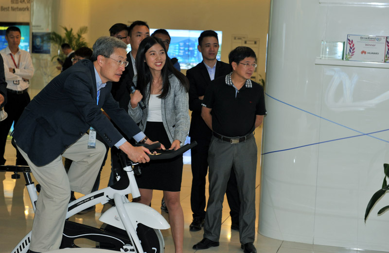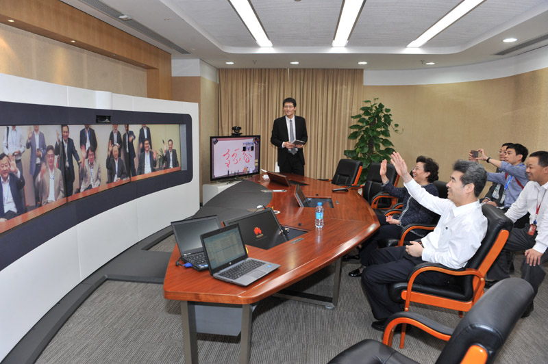 考察团成员在华为体验其视频会议系统。(图片来源:中央政府驻港联络办)