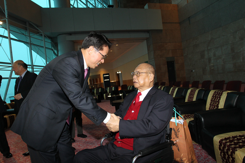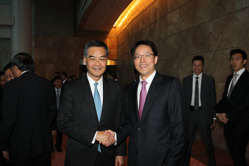 张晓明主任和应邀前来参加酒会的香港特区行政长官梁振英握手。(图片来源:中央政府驻港联络办)