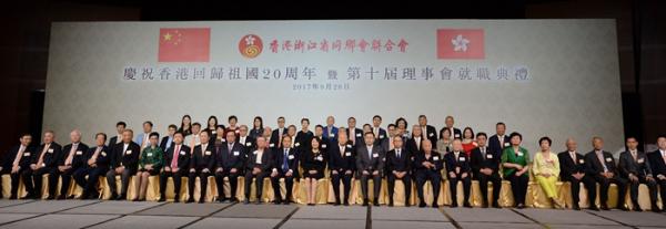 本网讯 9月28日,香港浙江省同乡会联合会庆祝香港回归祖国20周年暨第10届理事会就职典礼在香港会展中心举行。我办副主任何靖与浙江省政协副主席、侨联主席吴晶,外交部驻港公署副特派员胡建中,全国人大常委范徐丽泰,立法会主席梁君彦,特区政府民政事务局局长刘江华等出席典礼。香港浙联会创会会长李达三、会长詹耀良等900多名浙籍乡贤参加典礼。