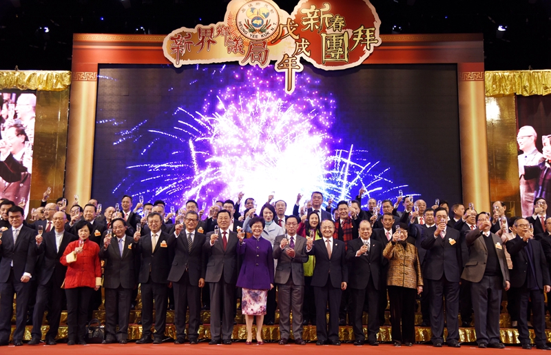 王志民主任(右六)、文宏武秘书长(左五)主礼新界乡议局戊戌年新春团拜活动。(图片来源:中央政府驻港联络办)