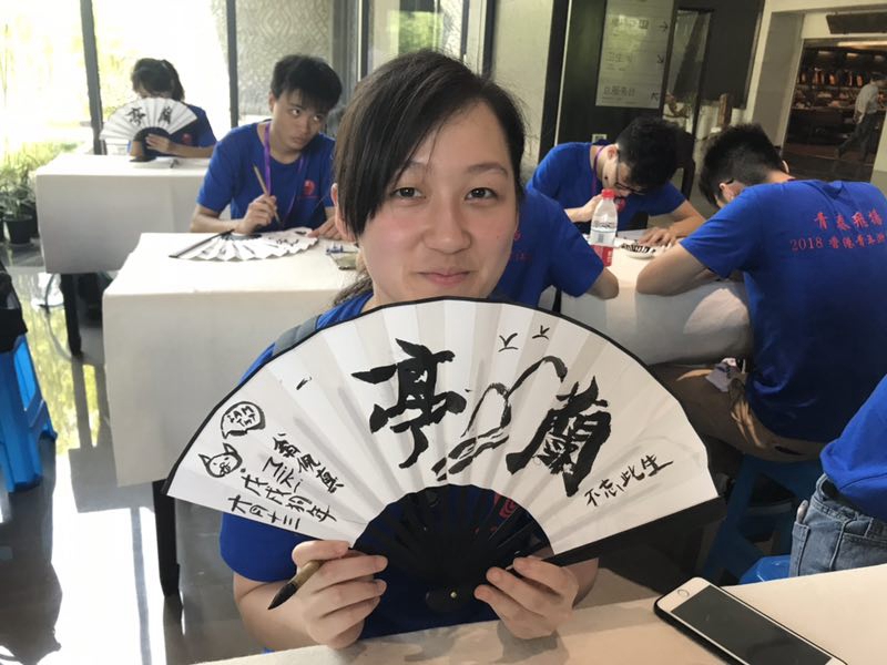 绍兴团同学在兰庭参观时,在扇子上写下“不忘此生”。