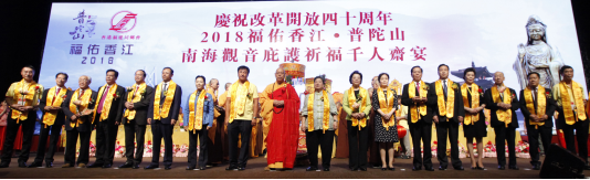本网讯 8月4日晚,我办副主任仇鸿应邀出席并主礼在香港会展中心举行的庆祝改革开放四十周年“2018福佑香江—普陀山南海观音庇福千人斋宴”。福建省政协主席崔玉英,中国佛教协会副会长、普陀山佛教协会会长道慈法师,内地有关部门负责人,在港闽籍乡亲和佛教信众逾2000人出席,共同祈福香港和谐稳定。