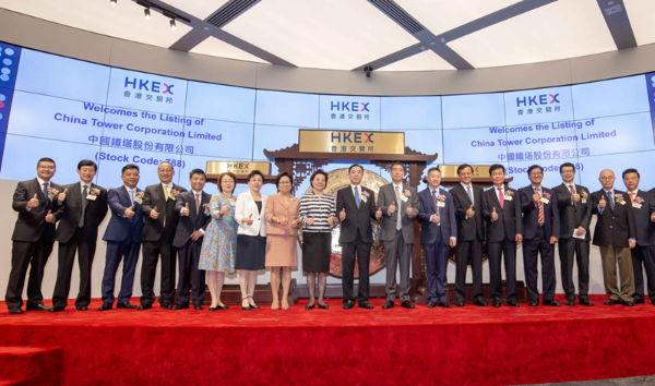 本网讯 8月8日上午,中国铁塔股份有限公司H股上市仪式在香港交易所举行。我办副主任仇鸿应邀出席,并与中国铁塔股份有限公司董事长佟吉禄、外交部驻港公署副特派员赵建凯、港交所主席史美伦、港交所行政总裁李小加等共同主礼。香港工商界知名人士约160余人参加仪式。