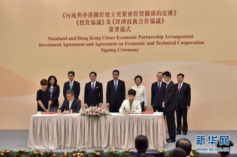 2017年6月28日在香港特区政府总部拍摄的《内地与香港关于建立更紧密经贸关系的安排》(CEPA)下的《投资协议》和《经济技术合作协议》签约仪式现场。 新华社发(王玺 摄)