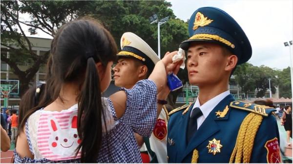 小朋友为解放军叔叔轻轻擦去额头汗水。(图片来源:香港文汇报)