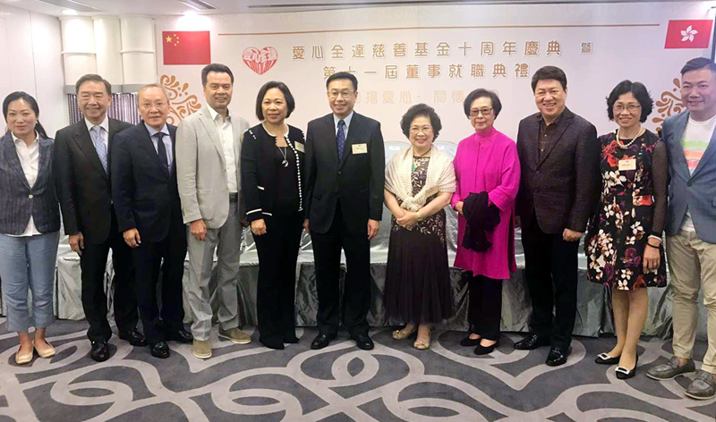 本网讯 9月5日,爱心传达慈善基金会在尖东帝国中心举办十周年晚宴。我办副主任何靖、港区全国人大代表颜宝铃、特区政府社会福利署助理署长郭李梦仪、九龙城警区指挥官李雅丽总警司等应邀担任主礼嘉宾。