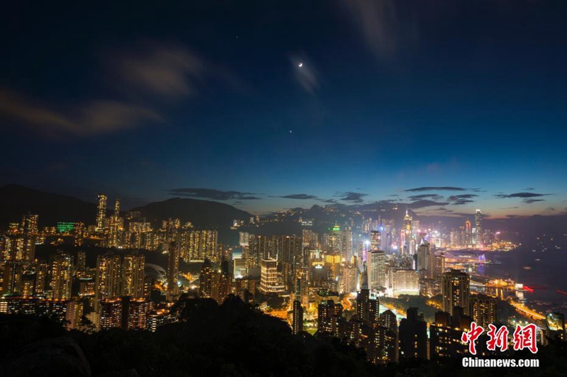 9月13日晚,香港夜空上演“双星伴月”的美丽天象。在西南方上空,金星(月亮下方)和木星(月亮左上方)陪伴在一钩弯月的两旁,形成一个大致的等腰三角形。金星是夜空中最亮的星星,而木星则是第二亮的星星,它们和夜空中最亮的天体月亮构成了难得一见的天文景观。 中新社记者 张炜 摄