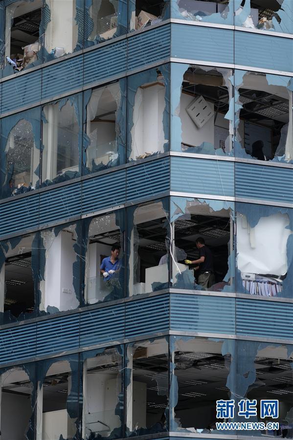 9月17日,在位于香港九龙半岛红磡海滨的一座写字楼中,工作人员在清理窗户破损的办公室。 随着强台风“山竹”逐渐远离香港,香港特区政府各部门已全力投入清理和善后工作。 新华社发(王申摄)