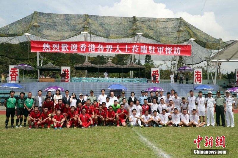 9月22日上午,在香港群力资源中心会长戴德丰博士点率领下,香港各界中秋探访团赴香港部队昂船洲军营慰问驻军官兵。中秋探访团由香港工商界人士、演艺界明星和赞助公司代表等共约200人组成,中央驻港机构主要领导也参加了此次活动。当天上午,在昂船洲海军基地有升国旗仪式、军乐团表演、军事夏令营足球队和香港明星足球队友谊赛、越野车巡游、演艺界明星和驻军文工队精彩演出等,上演军民同乐庆中秋热闹场面。中新社记者 洪少葵 摄