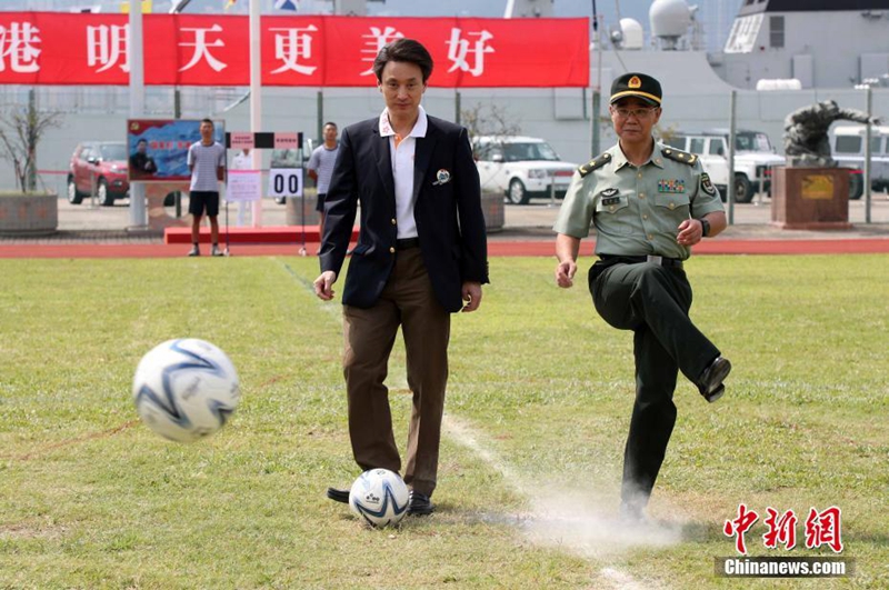 9月22日,驻港部队副政委陈亚丁(右)和军民同乐活动筹委会主席王祖兴主持开球礼。当天,香港各界中秋探访团赴香港部队昂船洲军营慰问驻军官兵。在昂船洲海军基地有升国旗仪式、军乐团表演、军事夏令营足球队和香港明星足球队友谊赛、越野车巡游、演艺界明星和驻军文工队精彩演出等。中新社记者 洪少葵 摄